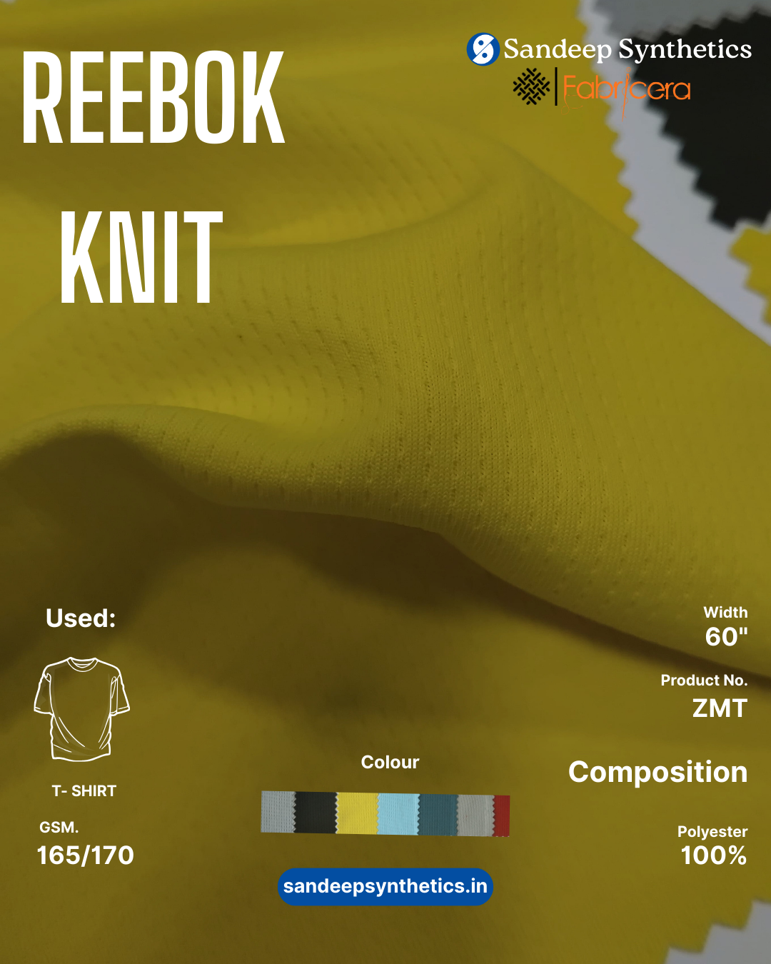 The image showcases a high-quality Reebok Knit fabric supplied by Sandeep Synthetics / Fabricera.